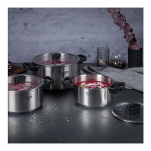 مجموعه قابلمه‌های Locarno با طراحی ساده و مدرن، از استیل ضدزنگ ۱۸/۱۰ با پرداخت مات ساخته شده‌اند و برای انواع پخت‌وپز روزمره ایده‌آل هستند. این قابلمه‌ها در چهار سایز مختلف عرضه می‌شوند تا نیازهای متنوع آشپزی را پوشش دهند.